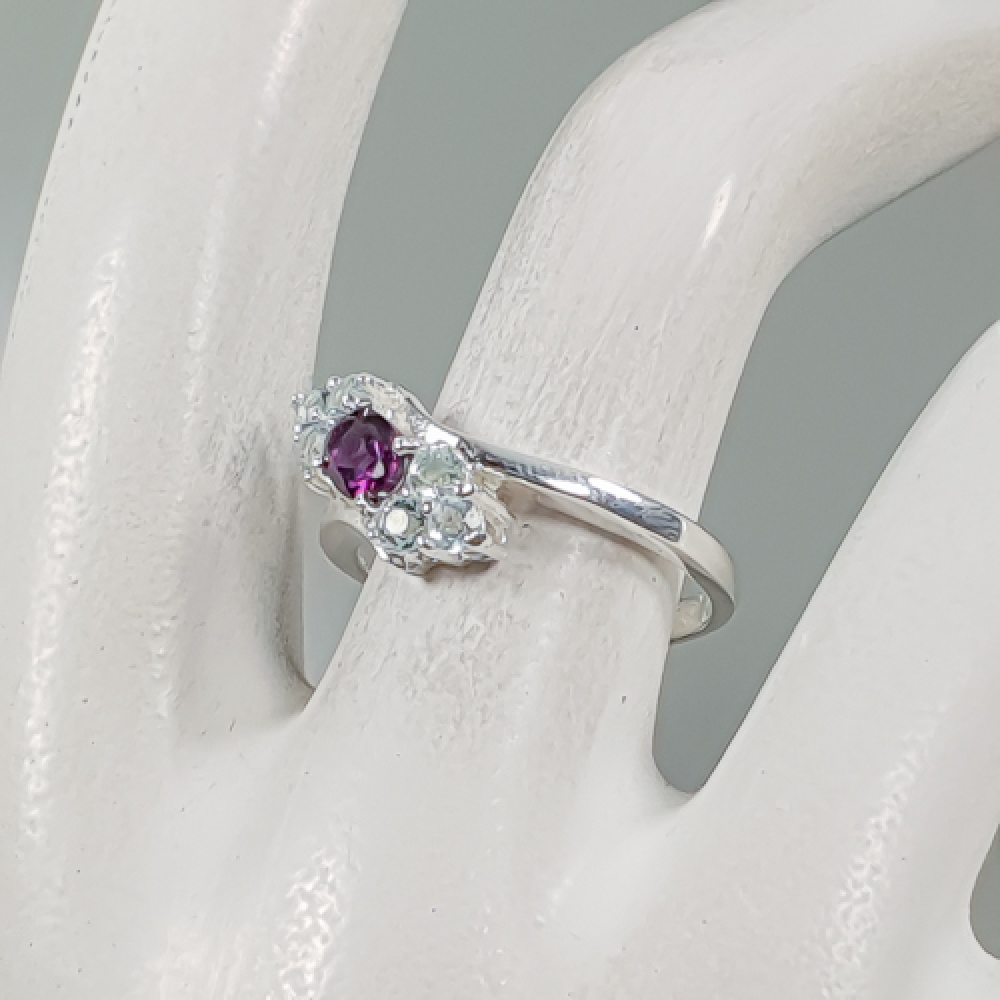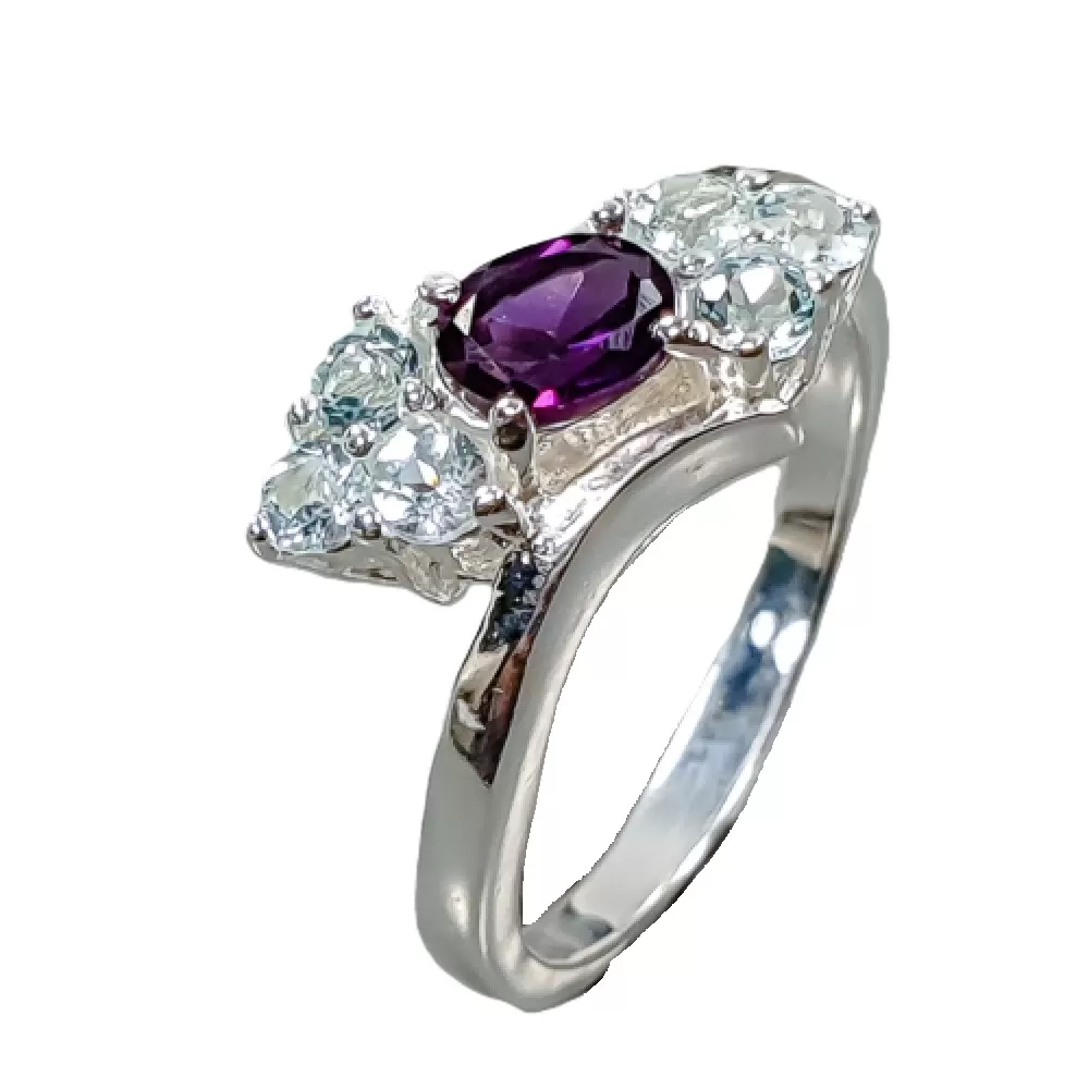 Bijuterie argint 925 cu piatra de rodolit ovala fatetata si o nuanta deosebita violacee, are ornamentele designului decorate cu aur alb si pietricele de topaz in nuante fine alb-bleu pentru a scoate in evidenta detaliile. Modelul princiar, fin si deosebit este o piesa rara pentru o marime delicata. Inel argint dama cu piatra rodolit deosebita, bijuterie unica.