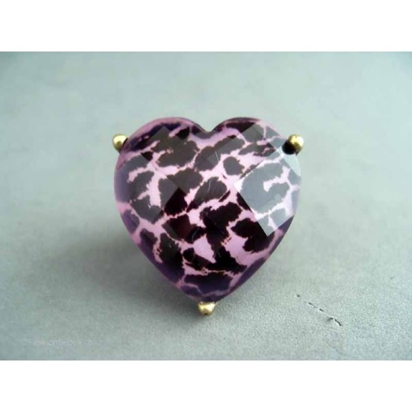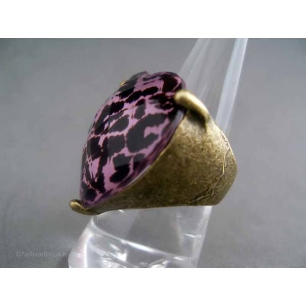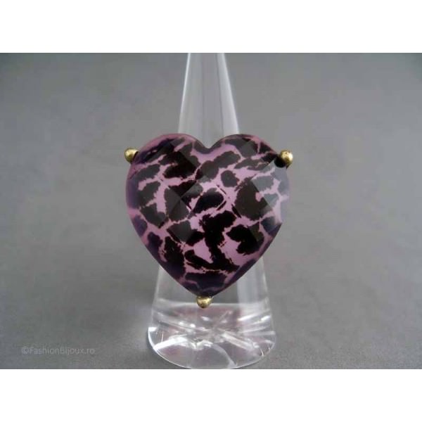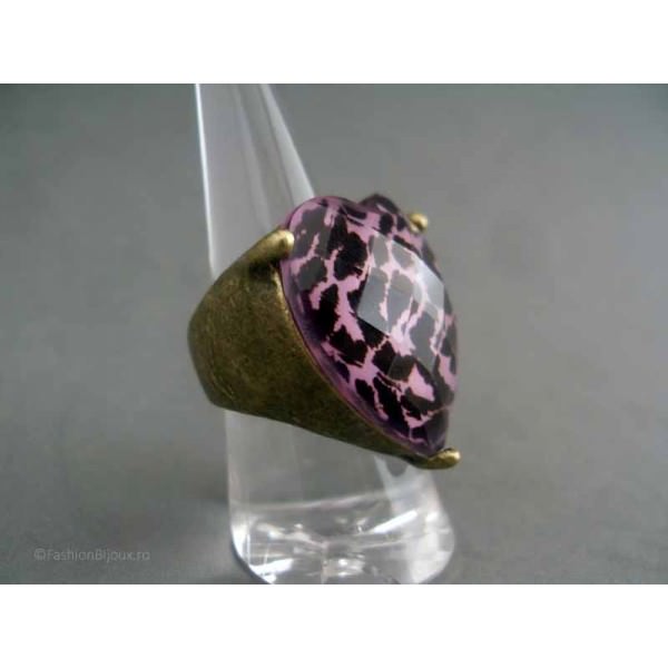 Inel auriu, model fashion cu inima, design vintage deosebit cu o montura lata, antic bronz, pe care e asezata o piatra mare in forma de inima, transparenta, bombata, fatetata, baza acesteia avand un print cu model de leopard in culorile roz, usor plaman si negru.